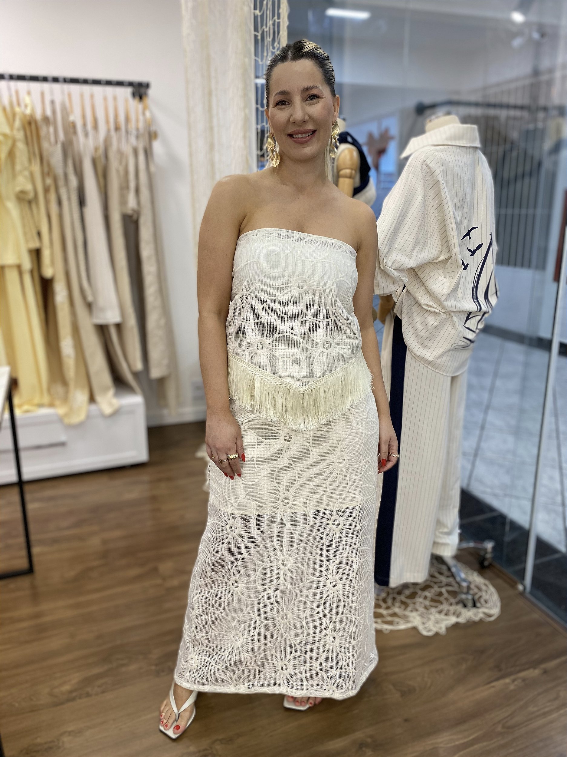 A blusa sem alça é confeccionada em renda floral com transparência elegante, trazendo um visual leve e sofisticado.