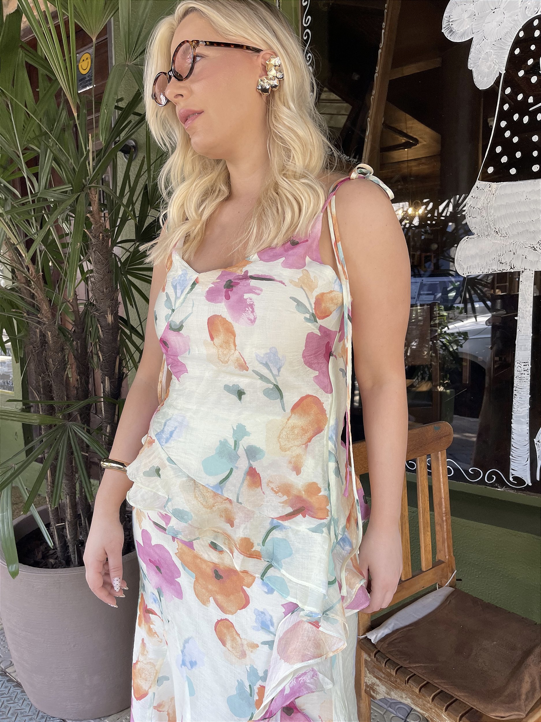 A estampa floral em tons vibrantes e alegres adiciona leveza ao look.